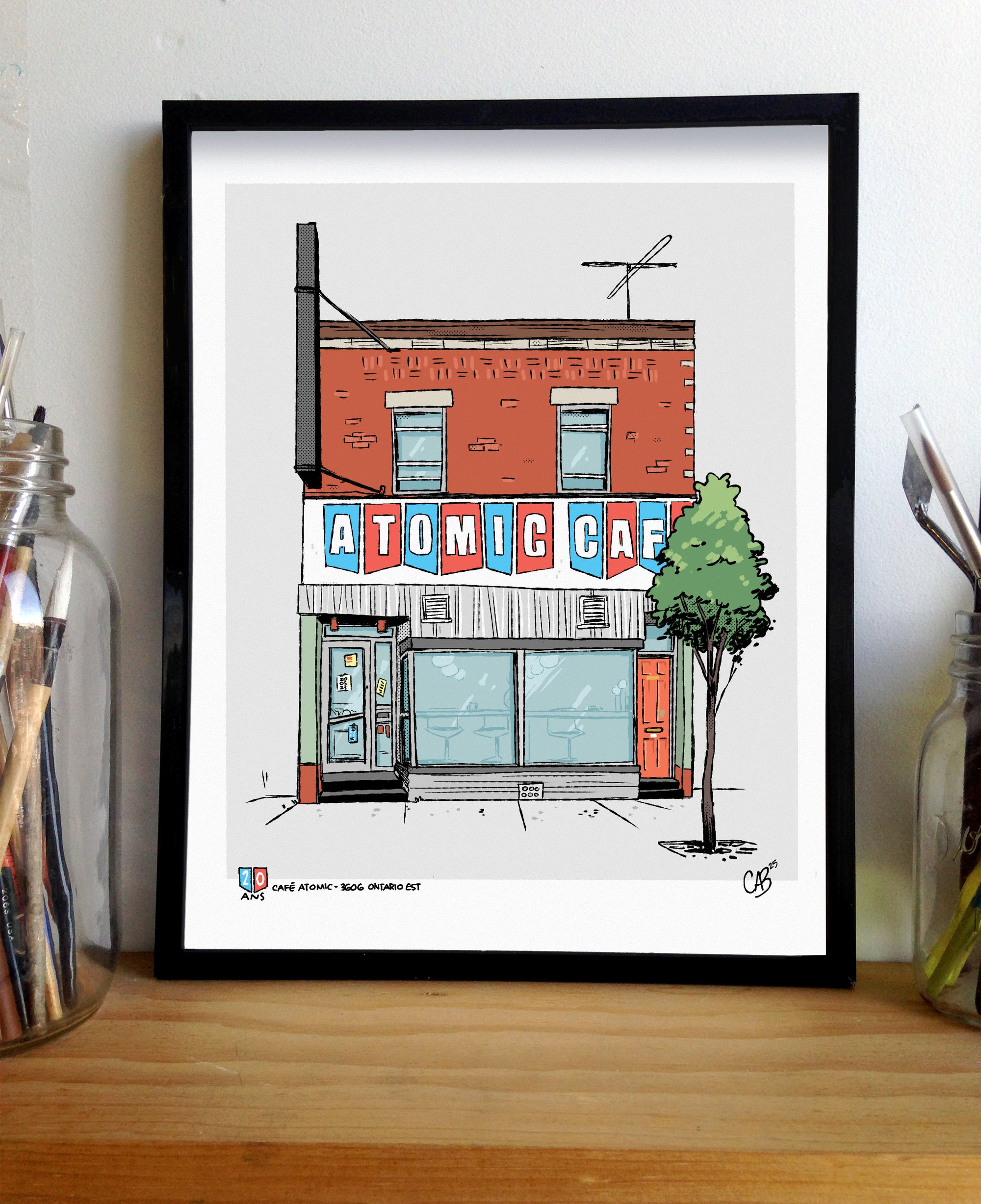 Le Café Atomic dans Hochelaga fête ses 20 ans en 2025! Pour l'occasion, j'ai retouché le print orignal pour en faire une édition limitée et numérotée. Ça mérite un p'tit café ça!