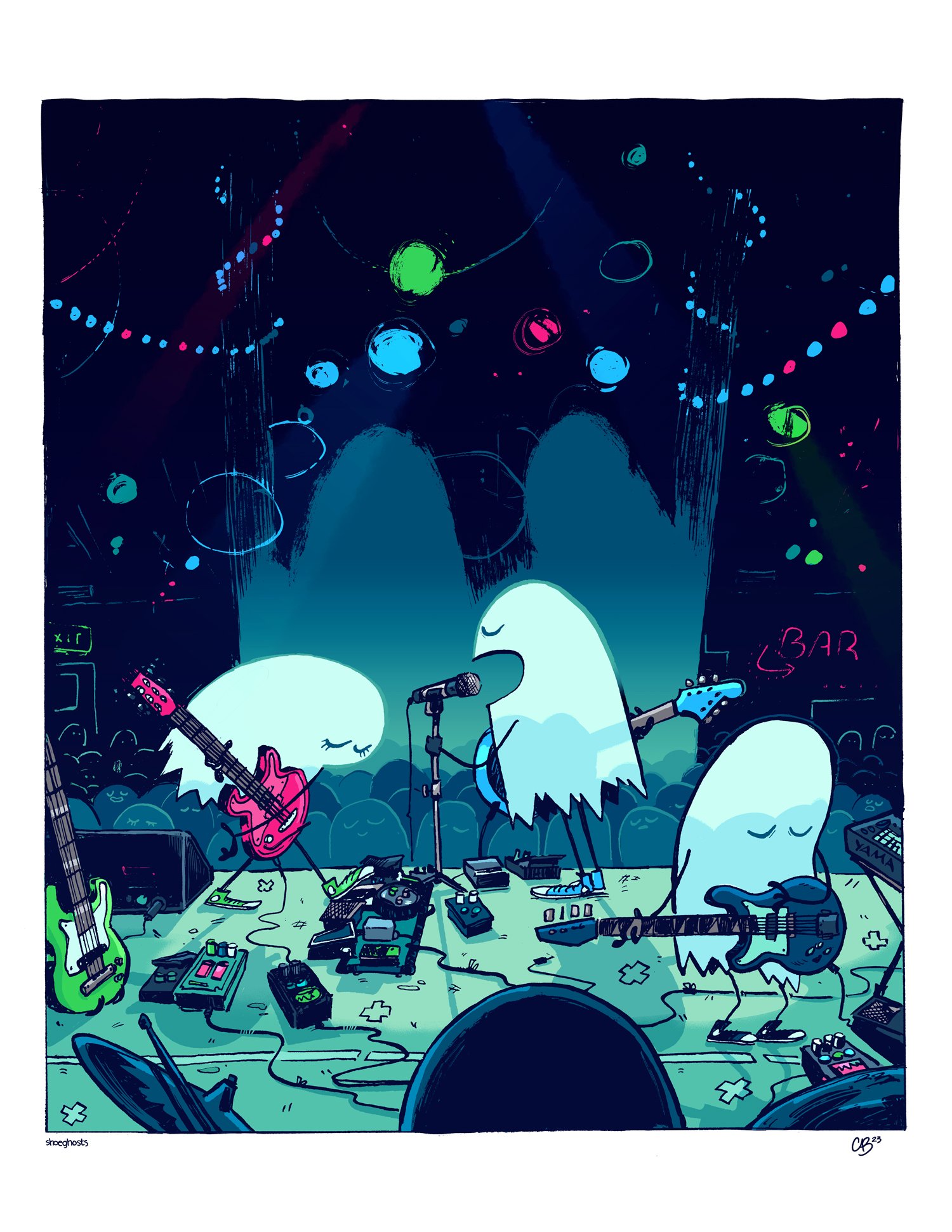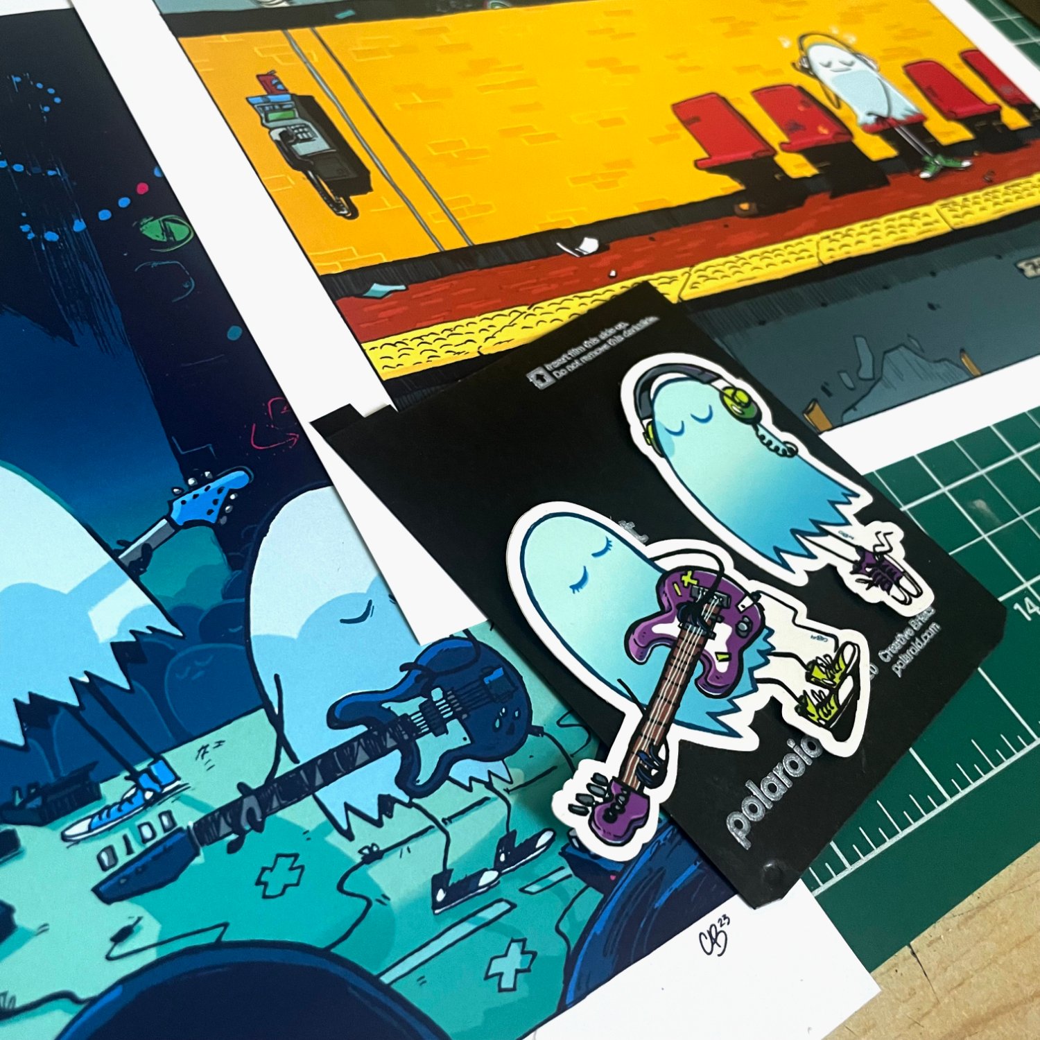 Bundle of three prints and two vinyl stickers depicting the coolest, chillest ghosts you know. They're in a band and honestly, they're pretty good! The prints look great next to a record collection and the stickers will provide an extra haunted vibe to anything you possess. The prints are also available separately but this is the only way to get your hands on the stickers!